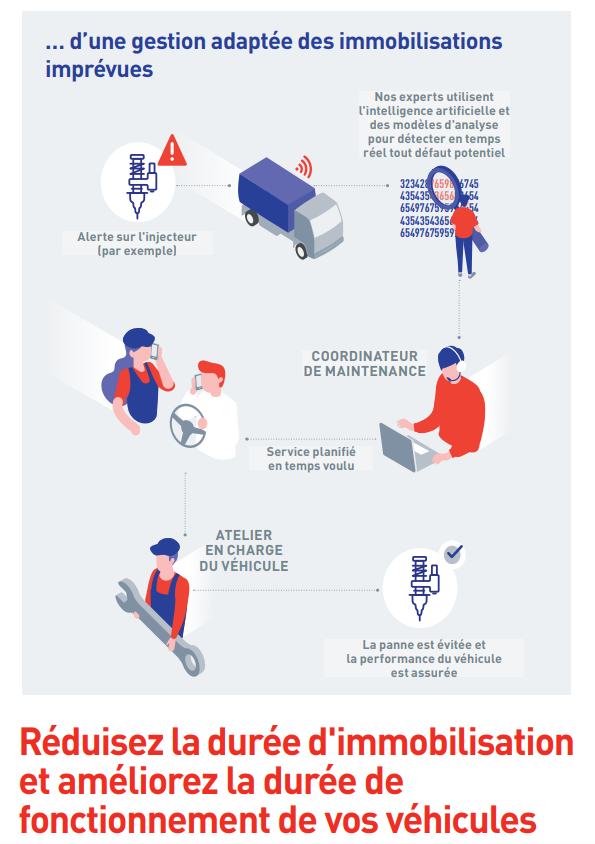 Pré-diagnostics, corrections de service et mises à jour de la flotte : cette solution, incluse dans l'offre PREDICT, vous fait gagner du temps et garantit une disponibilité maximale de votre véhicule en évitant les visites d'entretien inutiles.