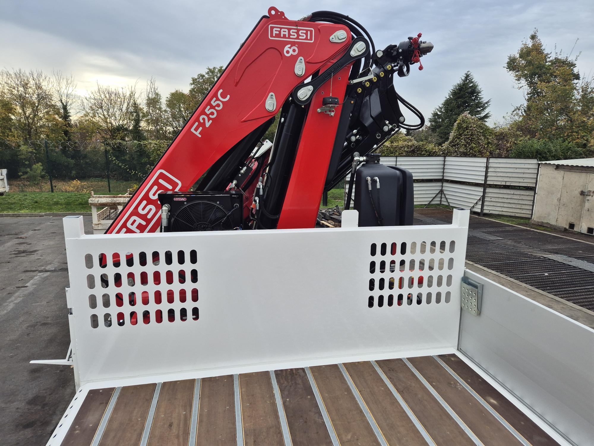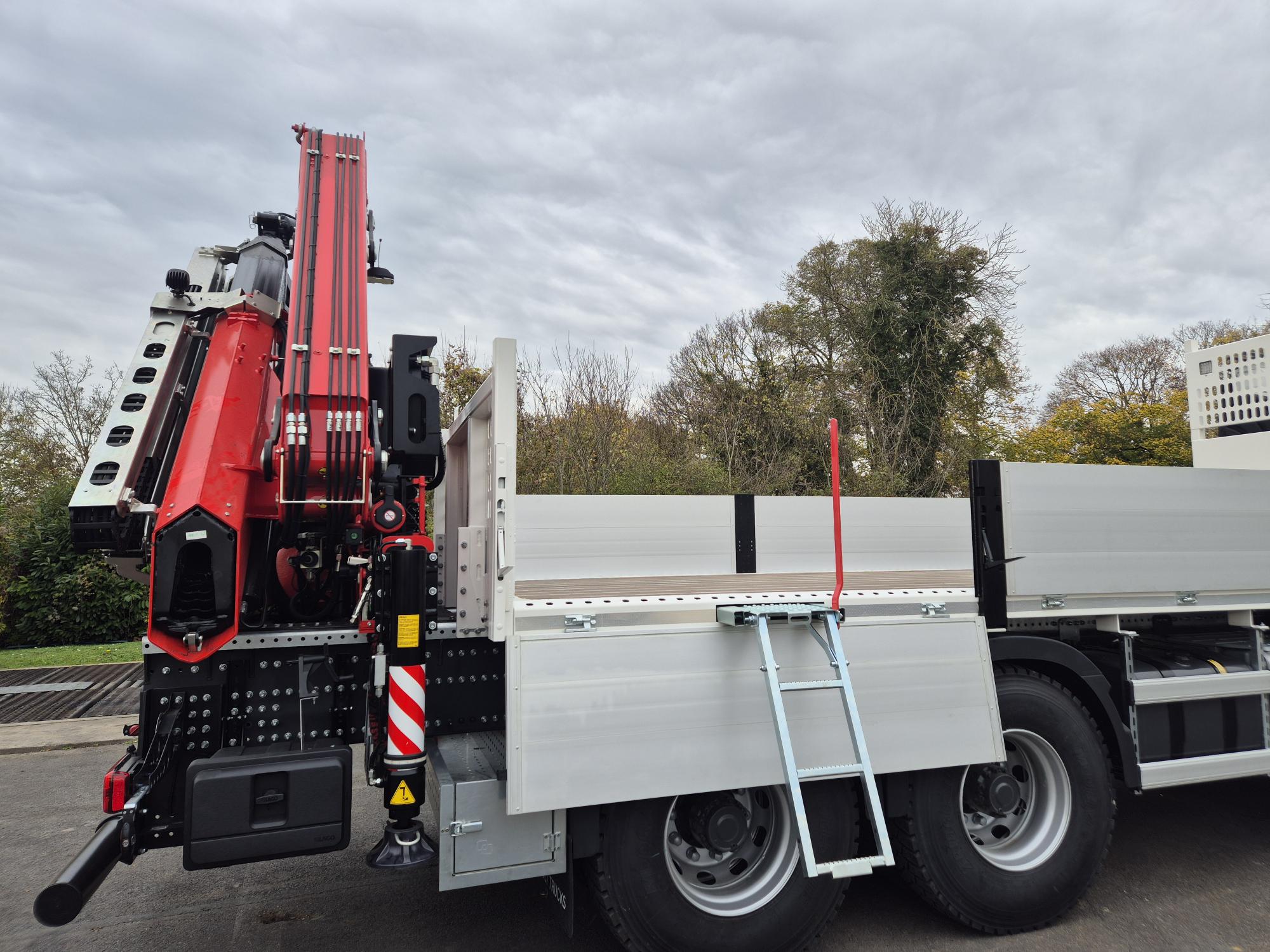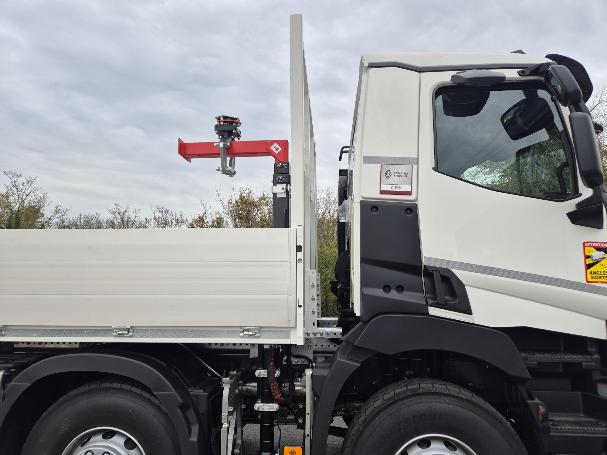 Porte échelle grillagée hauteur cabine, Fixations lève palette, coffre PVC ,coffre porte équerre , 2 plaques d’appuis avec box de rangement